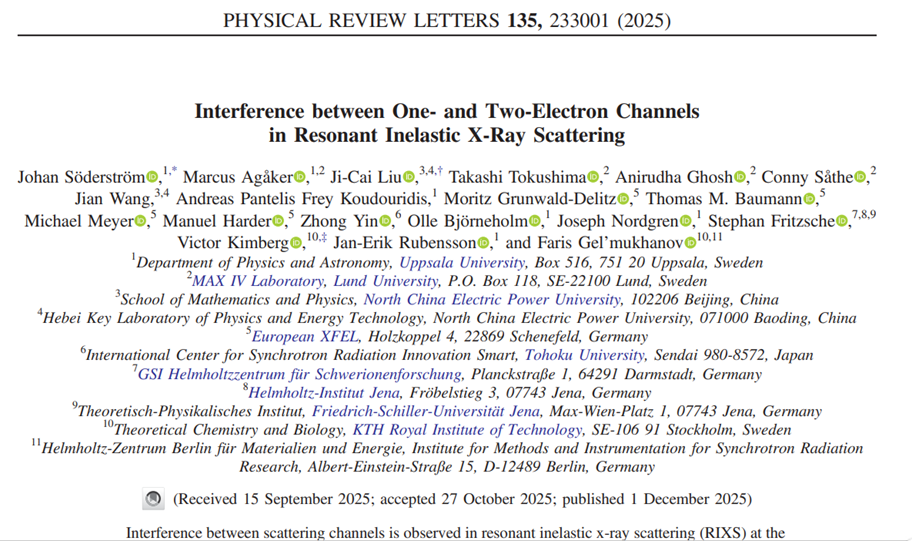 近日,公司6776永利集团刘纪彩教授团队与瑞典乌普萨拉大学、隆德大学、瑞典皇家工学院、欧洲XFEL等多个国际知名实验团队合作,在物理学领域顶级期刊Physical Review Letters上发表了《Interference between One- and Two-Electron Channels in Resonant Inelastic X-Ray Scattering》学术论文,刘纪彩教授为论文的共同通讯作者(理论工作),博士生王翦参与论文的计算模拟。